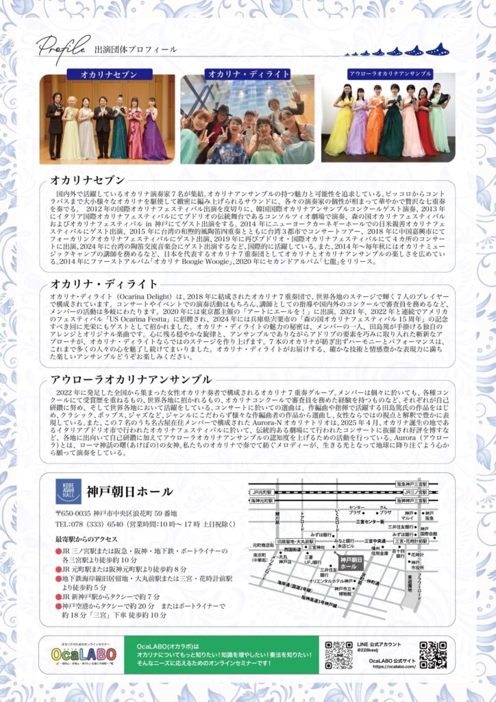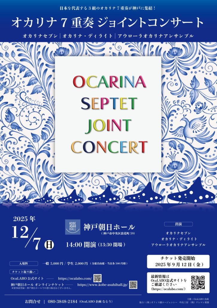 オカリナ7重奏ジョイントコンサート 日本を代表する3組のオカリナ7重奏が神戸に集結! 2025年12月7日(日) 開演:14:00 (開場:13:30) 会場:神戸朝日ホール (神戸市中央区浪花町59番地) 料金:一般 5,000円 学生2,000円(当日各500円増) 全席自由 出演:オカリナセブン オカリナ・ディライト アウローラオカリナアンサンブル 主催:OcaLABO企画 ※チケットの発売日 9月12日