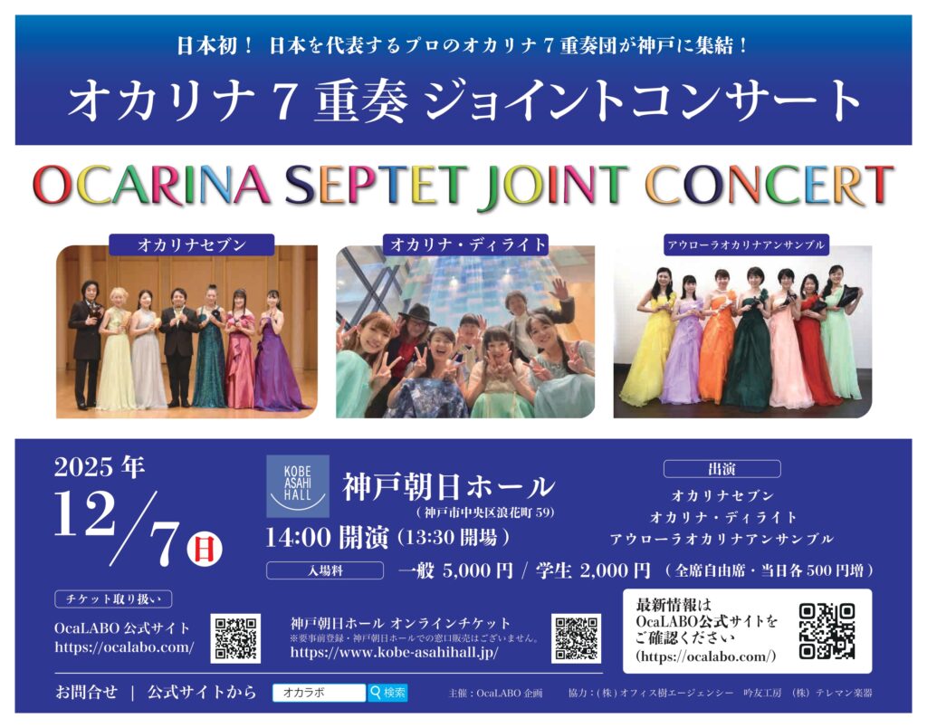 日本で”初”の『オカリナ7重奏団ジョイントコンサート』が12月7日に神戸で開催されます!